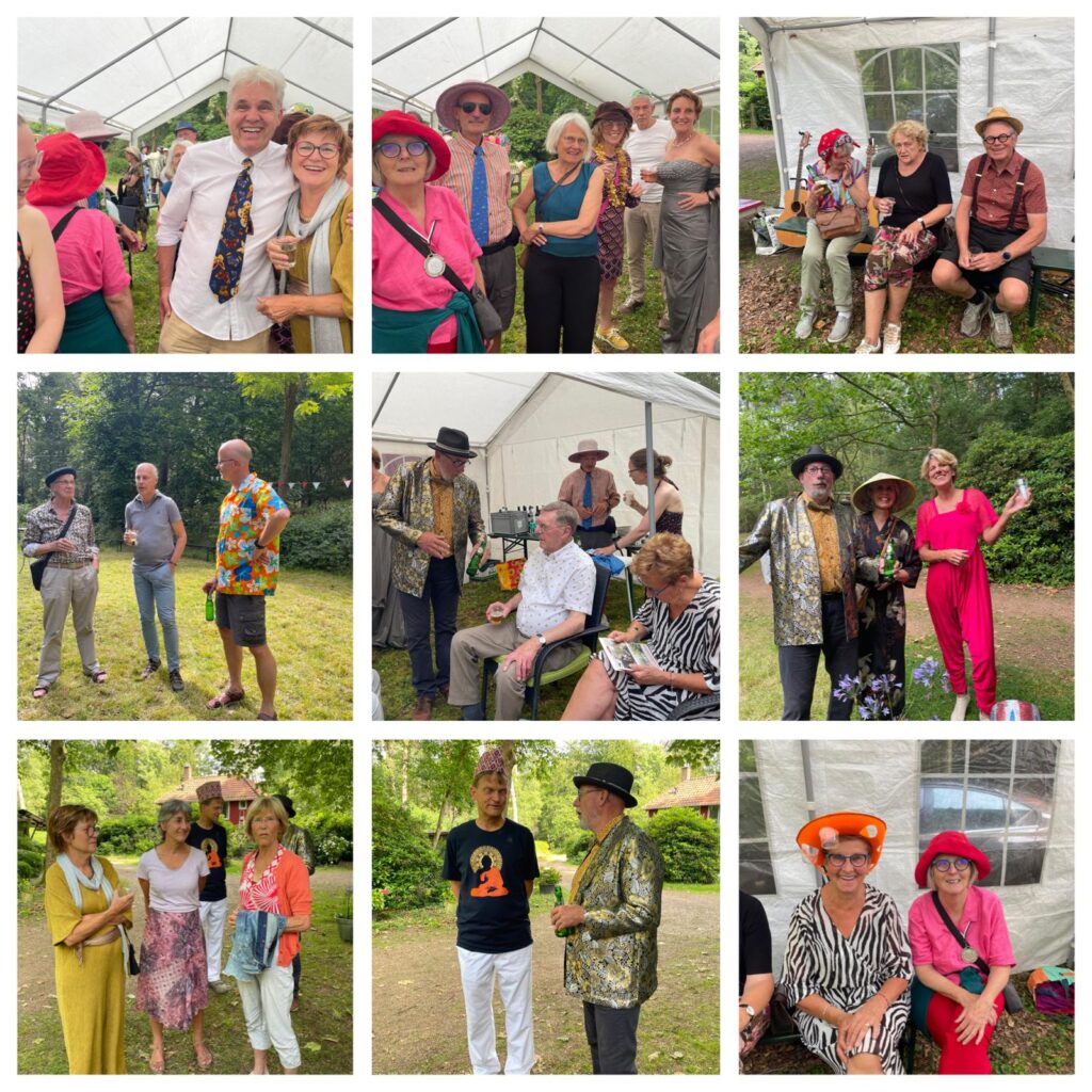 Op een prachtige plek in het bos, in de omgeving van het vertrouwde Panhuys, kwamen op zaterdag 29 juni ruim veertig hlg-ers samen om het 70-jarig bestaan van de hardloopgroep te vieren. De dresscode van de feestcommissie luidde ‘extravagant’, wat mooie creaties opleverde. De tent was opgezet, de sauzen en salades stonden klaar en de BBQ hoefde alleen nog maar te worden aangestoken. Ook voor een podium was gezorgd en leden waren van harte uitgenodigd om verstopte talenten te laten zien. Dit zorgde voor een aantal zeer leuke optredens, zowel muzikaal als in de vorm van een quiz. Meezingen mocht en het bleek dat niet alleen hardlopen, maar ook samen zingen sterk verbindend werkt. Er werden oorkondes uitgedeeld, waarbij vermelding van het 70-jarig lidmaatschap van Ton Kolsteeg niet onbenoemd mag blijven. Hij was bovendien aanwezig om deze in ontvangst te nemen. Reken maar uit hoe bijzonder dit is. Toen het na het eten ondanks gunstige voorspellingen toch niet droog bleef, was het tijd voor een dansje in de regen. Muziek uit alle perioden van de vorige eeuw kwam voorbij en zo eindigde het feest met dezelfde vrolijkheid als waar het die middag mee begonnen was.
